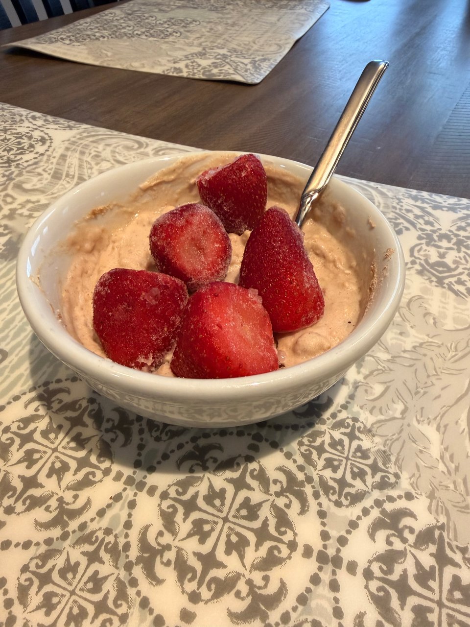The ingredients are the same. But instead of putting everything into my blender, I add in psyllium husk — a fiber supplement that absorbs liquids — pop the frozen strawberries on top, and let the whole bizarre looking bowl sit in the fridge for an hour or two.